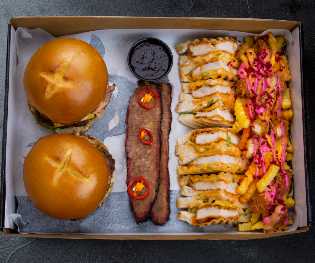بوكس مكون من 2 أولد بيف برجر - 100 جرام من شرائح البريسكت المدخن لمدة تصل إلى 12 ساعة - بطاطس مقلية وساندوتش الزنجر كلوب بالإضافة إلى الديناميت تشكن