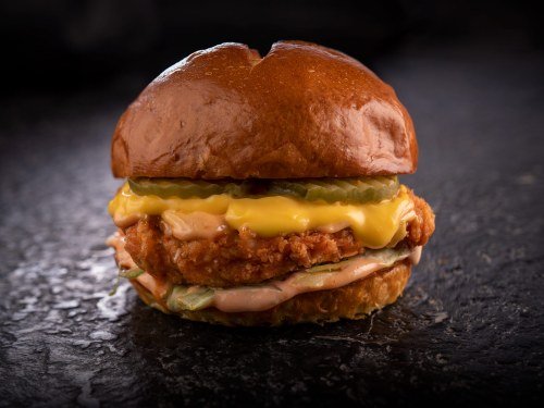 Burger made with fried chicken breast, with My sauce and Lishlazz’s sides