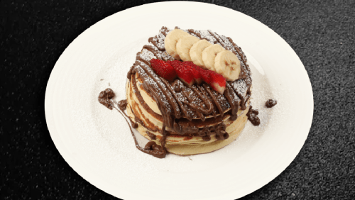 Golden pancakes covered in rich chocolate with fresh strawberries and sweet bananas, in addition to Lishlazz’s special sauce.