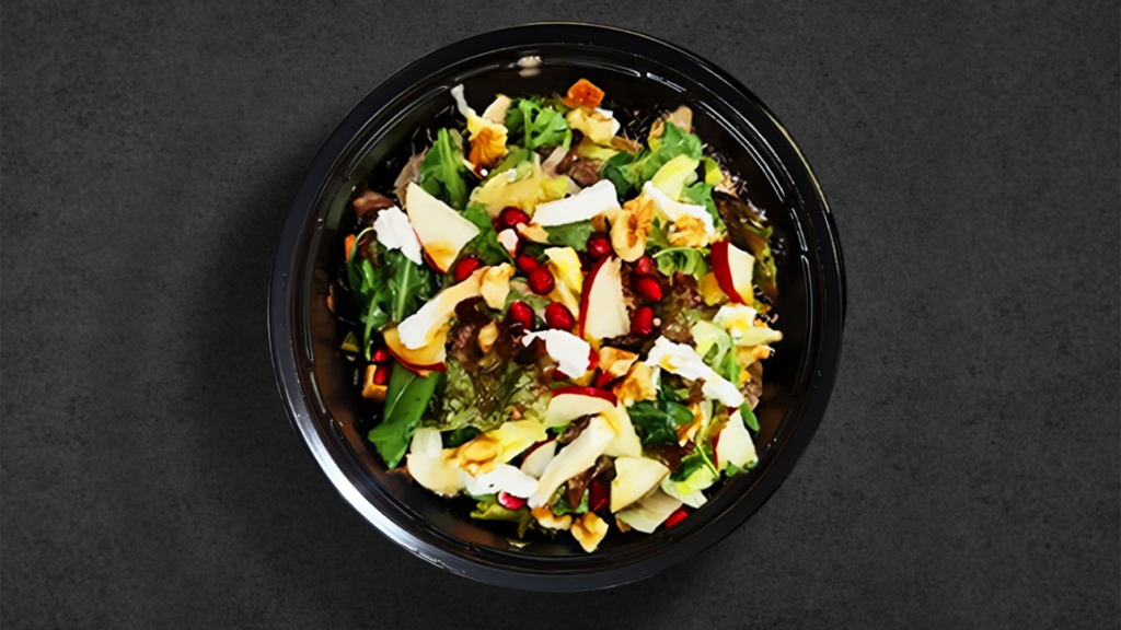 Rocca - lettuce - arugula - red lettuce - apple - raisins - pomegranate - walnuts - onions - cheese - Lishlazz special rocca sauce.