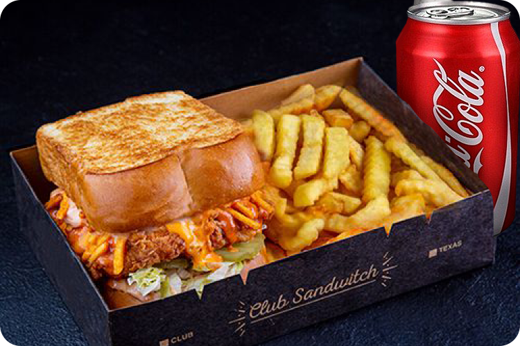Box contains fried chicken sandwich - My sauce - fresh lettuce - delicious cheese sauce and spicy sauce - crispy potato sticks with brioche bread, in addition to French fries and extra spicy sauce or My sauce - cola