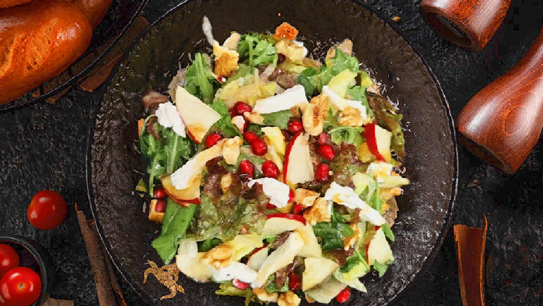 روكا – خس – جرجير – خس أحمر – تفاح – زبيب – رمان – جوز – بصل – جبنة – صوص الروكا الخاص بليشلازز