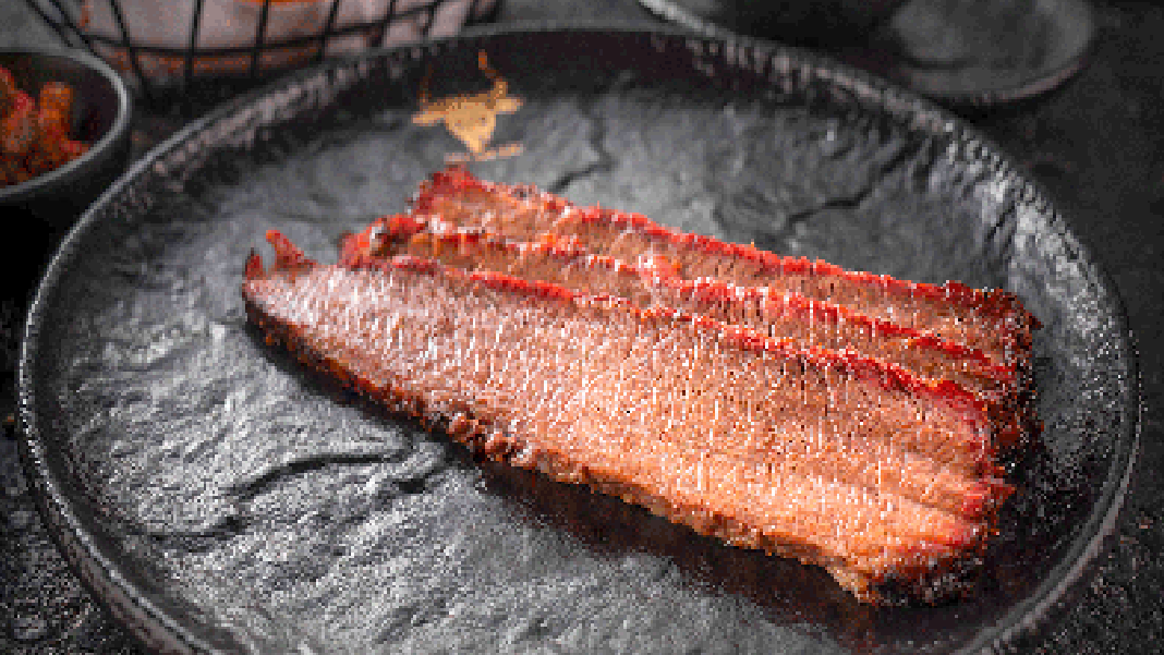 200 جرام من شرائح لحم البريسكت المدخنة في فرن الحطب حتى 12 ساعة على نار هادئة، تقدم مع صوص الباربكيو والهلابينو وإضافات ليشلازز
