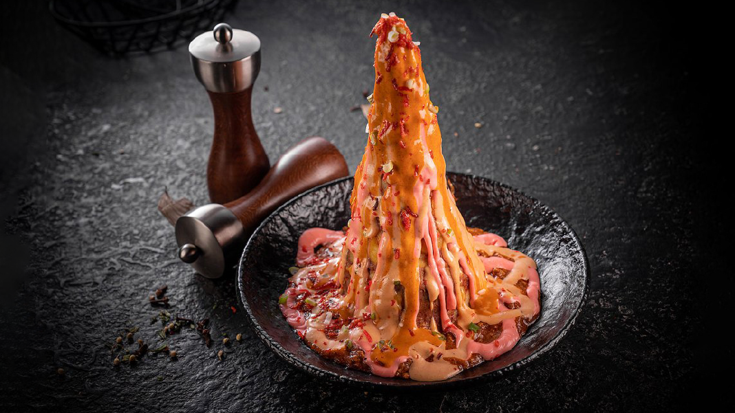 بطاطس مقلية محضرة على شكل جبل الكليمنجارو بالإضافة إلى لحم البريسكت المدخن وصوص سلوبي جو المحضر بالطريقة الأمريكية بالإضافة إلى عدة صوصات متنوعة تكفي ثلاثة أشخاص